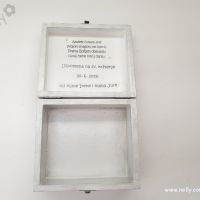 Kutija je drvena, domaće proizvodnje. Vanjska dimenzija je 14x16x8 cm. Unutarnja dimenzija je 13x15 cm. S unutarnje strane poklopca ide neki od ponuđenih tekstova ili tekst po želji uz nadoplatu.